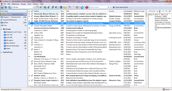 I have at the moment 426 references in it – and a dozen more to be added – but I am sure it is going to expand in the next few months. All papers I have access to are attached and have highlights and notes/comments. The books have research notes such as where they are available, if I got it from an interloan or from Lincoln Uni itself. Also if the books are from Lincoln, they will have the library reference number. I am sure if I sum up all the hours I will save (re)searching for material in catalogs and trying to work out where those precious references I have read a few months ago are, it will save me a lot of time in the end!