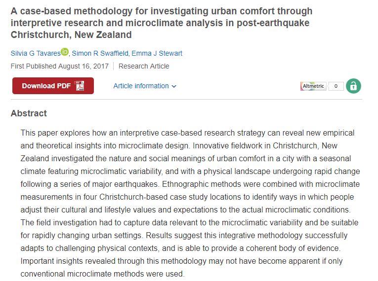 Simon Swaffield, Emma Stewart, and I recently published in Environment and Planning B: Urban Analytics and City Science a paper titled “A case-based methodology for investigating urban comfort through interpretive research and microclimate analysis in post-earthquake Christchurch, New Zealand”.