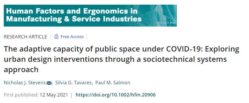 The coronavirus disease 2019 (COVID‐19) pandemic has had a dramatic impact on the way in which the community interacts within public spaces. Consequently, the design of these urban environments requires new approaches. It is our view that Human Factors and Ergonomics approaches can be used to provide these insights. This article explores the opportunities for making public spaces safer and more accessible for community use under pandemic conditions. The study utilizes a sociotechnical systems model of an archetype public space, developed pre‐COVID‐19, to explore the infrastructure and activities that are impacted by the introduction of the virus to the public space system. The aim was to identify those elements of the system that are completely unavailable under pandemic conditions, those elements that become limited in use, and those which remained unaffected by the presence of the virus. The findings show that under pandemic conditions pre‐COVID‐19 public spaces were surprisingly resilient with proportionally few elements within the model completely unavailable. They also demonstrate that overall, the public spaces system, while still operating, is significantly constrained in achieving and optimizing community and individual health and well‐being. The insertion of five (5) urban design interventions within the system model presented unique insights into the possibilities for optimizing adaptive capacity. These interventions revealed design opportunities across several levels of the systems model. Such insights are argued to assist in not only re‐establishing community access under pandemic conditions but also more inclusive access to a broader range of the community under all conditions.